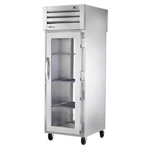 One of our highest recommended units is the STA1RPT-1G-1G-HC, a pass-thru refrigerator from True. The cabinet is constructed with high density, polyurethane insulation. The exterior is constructed using a stainless-steel front and an aluminum alloy top, back, and sides.. The frame rail is welded of heavy-duty steel, and coated with black powder to prevent corrosion. The single section glass doors in the front and rear include a positive seal self-closing feature, a stay open mechanism, and life-time guaranteed door hinges. The interior has bright LED lights that are activated when the door is opened and shine on three adjustable PVC coated shelves per section.