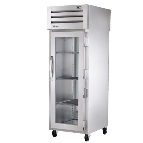 One of our highest recommended units is the STG1RPT-1G-1S-HC, a pass-thru refrigerator from True. The cabinet is constructed with high density, polyurethane insulation. The exterior is constructed using a stainless-steel front and an aluminum alloy top, back, and sides.. The frame rail is welded of heavy-duty steel, and coated with black powder to prevent corrosion. The single section glass door in the front and solid rear door includes a positive seal self-closing feature, a stay open mechanism, and life-time guaranteed door hinges. The interior has bright LED lights that are activated when the door is opened and shine on three adjustable PVC coated shelves per section.