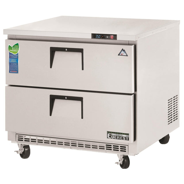 Drawered Undercounter/Worktop Refrigerator, one-section, 35-5/8"W, 10.0 cu. ft. capacity, self-contained rear mounted refrigeration, 16 gauge stainless steel worktop, (2) heavy duty drawers, digital controls with LED display, auto defrost, front air breathing, pressure relief port, stainless steel interior, stainless steel front & sides, galvanized steel bottom & rear, (4) 5" swivel casters (2 locking), R290 Hydrocarbon refrigerant, 1/5 HP, 115v/60/1-ph, 2.6 amps, cord, NEMA 5-15P, NSF, cETLus, ETL-Sanitation (drawer pans not included)