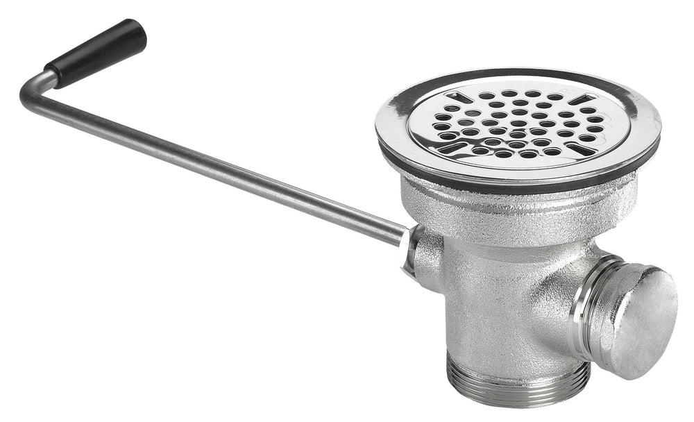 Krowne Twist Waste Valve with 1-1/4" Overflow Outlet with Cap, 3-1/2" sink opening, 2" NPS male threaded with 1-1/2" female threaded drain outlet (no adapter required), 4-1/2" flange, stainless steel strainer, flange & handle