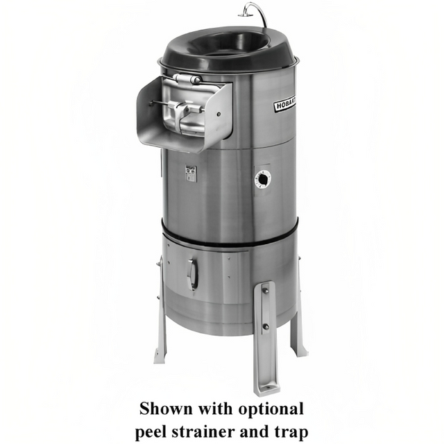 The Hobart 6430-3 Vegetable/Potato Peeler has a cylindrical construction, heliarc-welded stainless-steel with a removable NSF approved Lexan liner. The peeler and peel trap unit are glass-beaded stainless-steel. The plastic molded hopper cover is gray. The door, handle, discharge chute, and legs are cast aluminum and ball burnished for durability. At the bottom of the peeler unit is cushioned in a resilient rubber trim holding. The stainless-steel drive shaft has an advanced design for long life and performance.