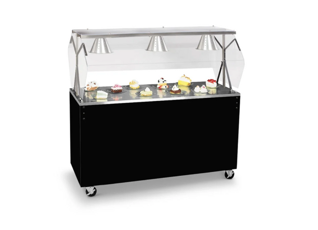 2-Series Affordable Portable™ Cold Food Station, non-refrigerated, (3) pan, 46"W x 39-1/2"D x 35"H, 6"deep stainless well with 1" drain, 35"H work surface, includes buffet style acrylic breath guard with 12" clearance, black finish solid base, (4) locking casters, NSF, Made in USA, made to order, cannot be cancelled or returned
