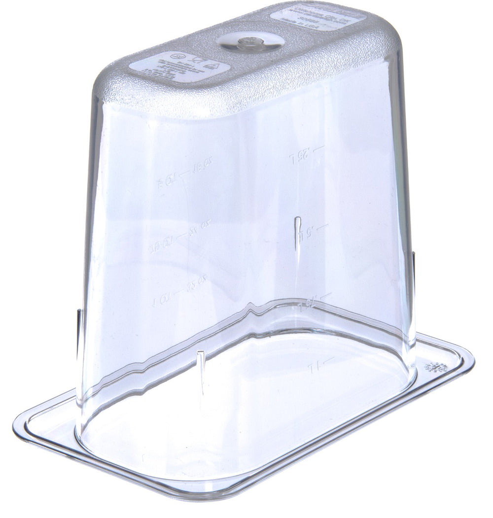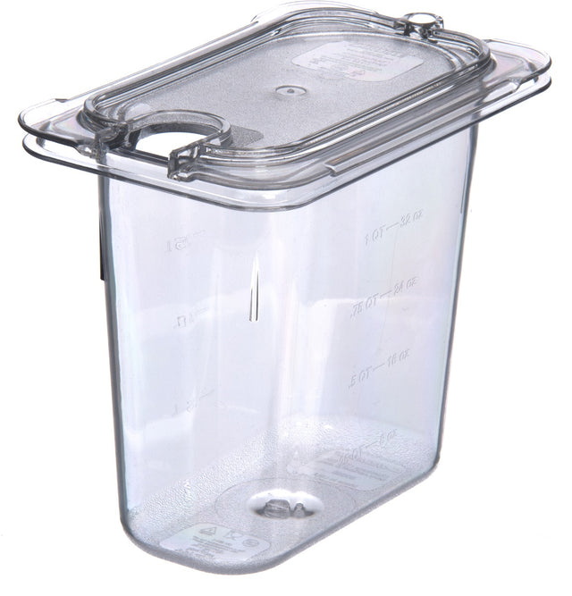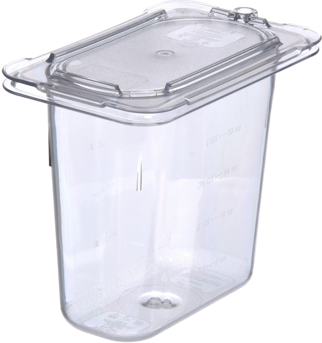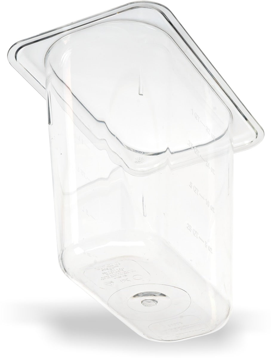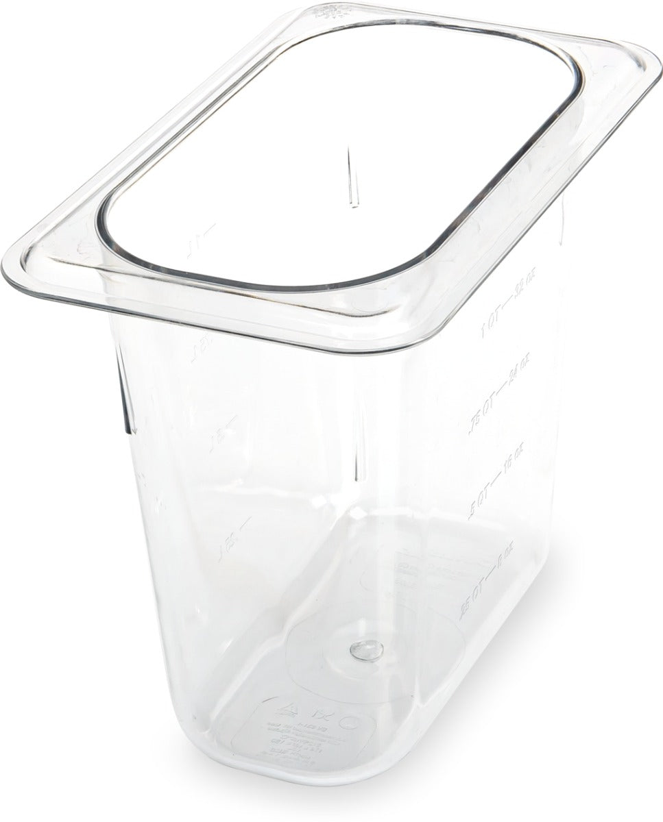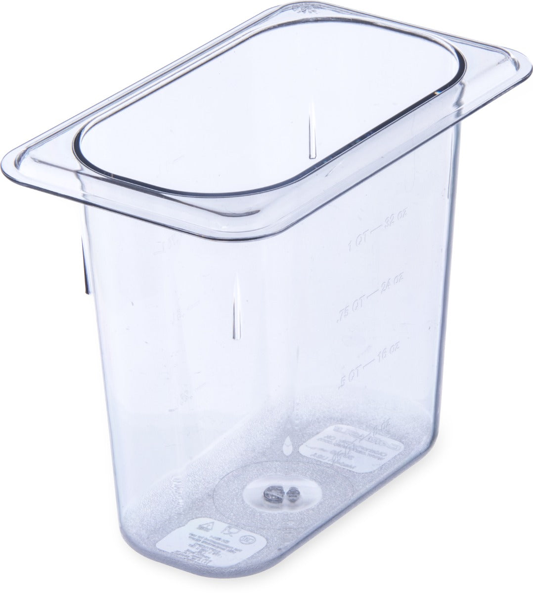 Food Pan, 1/9 size, 1.4 qt. capacity, 6-3/4" x 4-1/4" x 6", molded-in capacity indicators, temperature range: -40° - 212° F, reinforced top & bottom corners, spoonable bottom, dishwasher safe, smooth interior finish, textured non-slip exterior finish, polycarbonate, clear, NSF, Made in USA