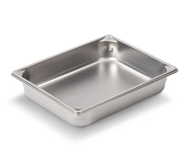 The Vollrath 30122 Super Pan V® two-third-size pan has a bright finish and smooth curves, enhancing the presentation of any dish. Made of stainless steel, the pan resists rust and provides durability. For additional strength, the pan has reinforced corners. Stackable with other pans, it resists jamming.