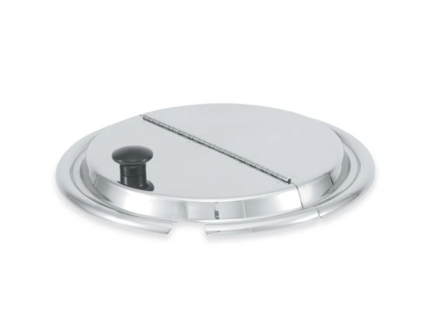 Keeping moisture, hot air, and heat contained within the pot, the Vollrath 47490 hinged inset cover is designed to be placed on top of an inset pot. In addition to helping maintain cooking processes, this cover preserves life of prepared food. To put some elegance into a serving station, its stainless steel features an appealing mirror finish. A black phenolic knob enables lid opening while lowering the risk of touch burns, and because the lid is hinged, half of it remains closed while product is being served to reduce thermal loss.
