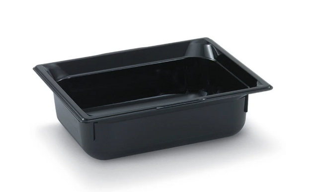 Super Pan® 1/1 GN Food Pan, 4" deep, low-temp polycarbonate black plastic, top flange corners with concave indentation, anti-jamming, ramped sides, reverse form flattened edge, framing shoulder, interchanges with SPV stainless steel pan line, NSF, meets gastronorm (EN 631-1) standard, Made in USA