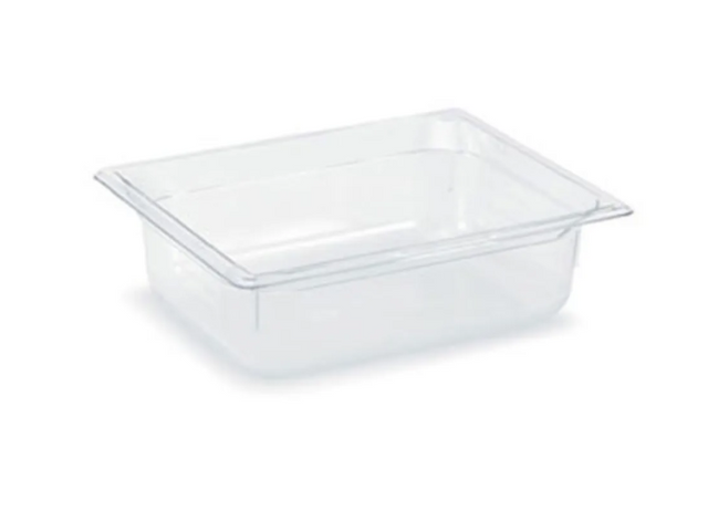 Super Pan® 1/2 GN Food Pan, 4" deep, low-temp polycarbonate clear plastic, top flange corners with concave indention, anti-jamming, ramped sides, reverse form flattened edge, framing shoulder, interchanges with SPV stainless steel pan line, NSF, meets gastronorm (EN 631-1) standard, Made in USA
