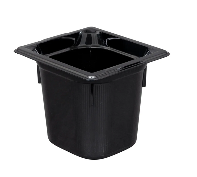 Super Pan® 1/6 GN Food Pan, 6" deep, low-temp polycarbonate black plastic, top flange corners with concave indention, anti-jamming, ramped sides, reverse form flattened edge, framing shoulder, interchanges with SPV stainless steel pan line, NSF, meets gastronorm (EN 631-1) standard, Made in USA