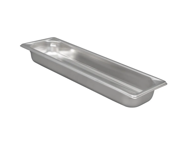 The Vollrath 90522 Super Pan 3® half-size pan can hold 3.9 quarts and measures 6.375 inches long by 20.875 inches wide by 2.5 inches deep. To maximize storage space, it can be stacked with pans of a similar size, and lugs prevent it from getting stuck. The corners have a spout-like shape that reduces spills when pouring product out. These corners are reinforced for durability, and the edges are resistant to bending.
