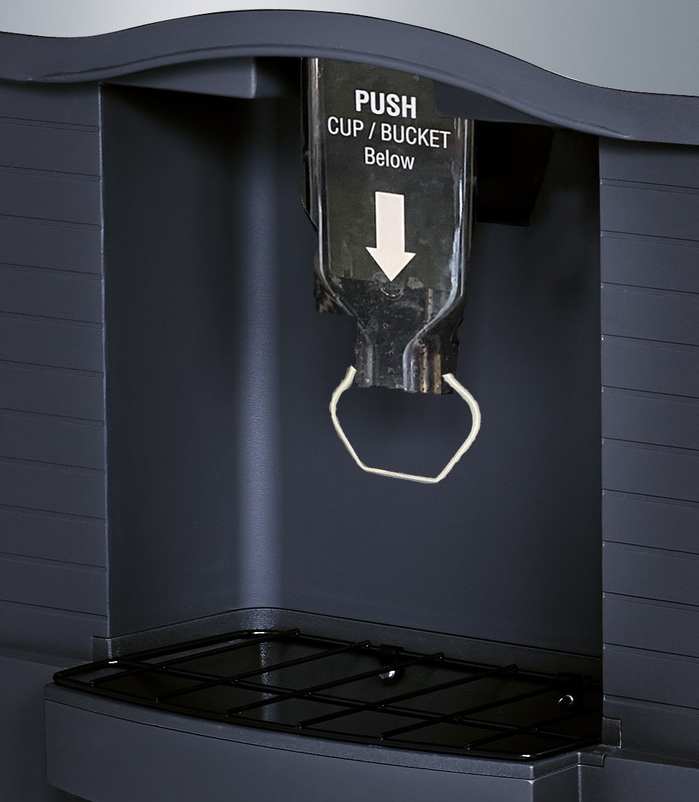 This machine can hold up to 180 pounds of ice in storage and features a design for filling both ice buckets and glasses. The touch-less lever activated ice chute means the ice bucket or glass is used to dispense ice, not a hand. It has a built in, efficient agitator and assures 100% dispensing. The oversized drain pan collects larger quantities of ice overflow.