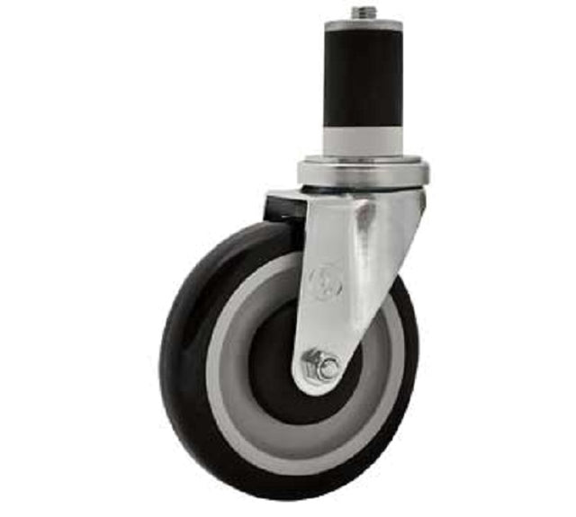 Caster, 5" diameter expanding stem, Fits 1-5/8" OD tubing, top lock brake, non-marking polyurethane tread, 300 lb. capacity, resistant to acids & caustics, double ball bearing, operational temp range -45° to 180° F, zinc plated, NSF