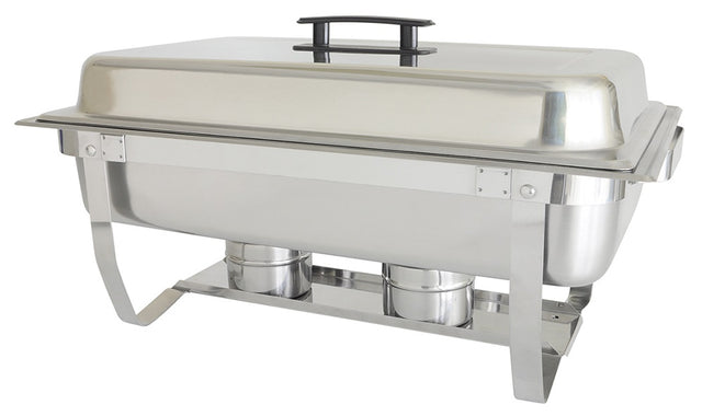Chafer, 8 quart, full-size, with folding stand, welded frame, dripless water pan, lift-off cover with plastic handle, duel fuel holder, stainless steel, mirror-finish