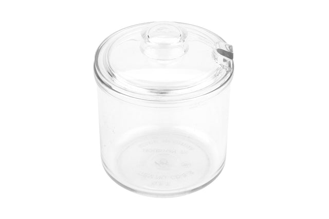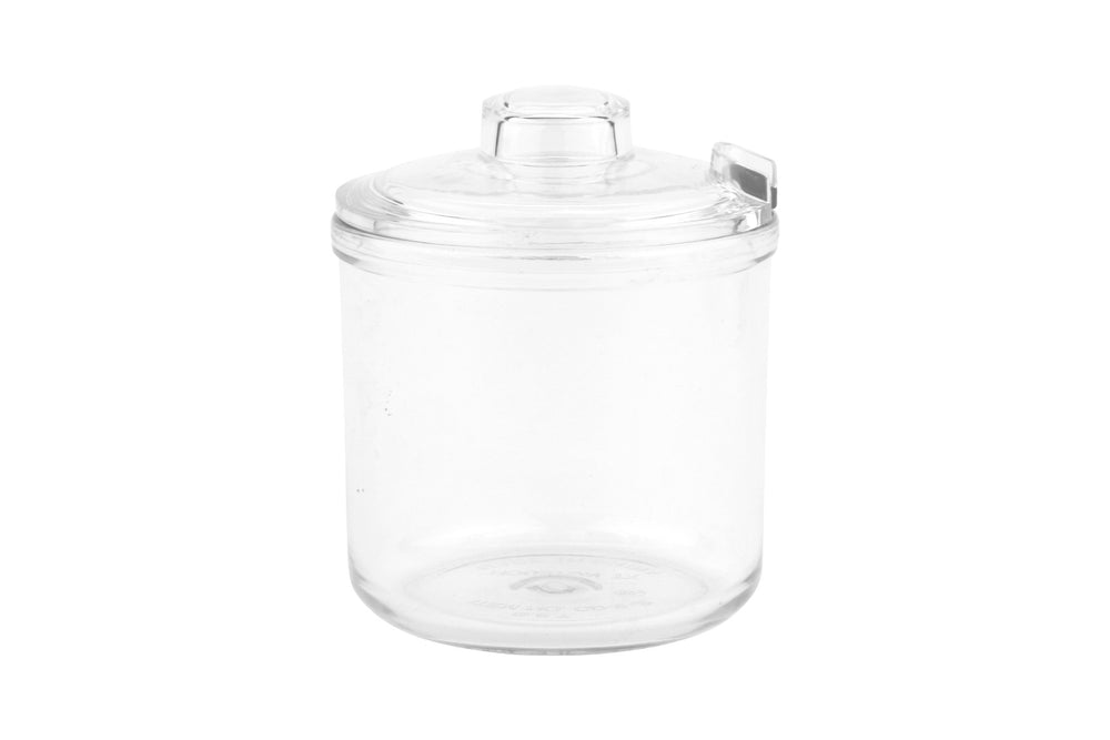 This condiment jar with lid is the perfect tabletop accessory to add flavor to food and the restaurant's ambiance. This 8 ounce condiment jar is 3" in diameter and 2-3/4" deep. It is break-resistant to help lower replacement costs and commercial dishwasher safe.