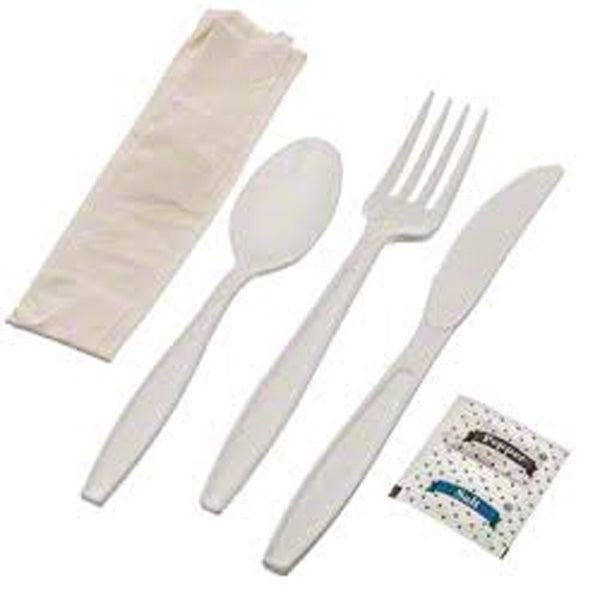 This 6 piece White Plastic Cutlery Kit includes one fork, spoon, knife, napkin, and a salt & pepper packet per package. Great for picnics.