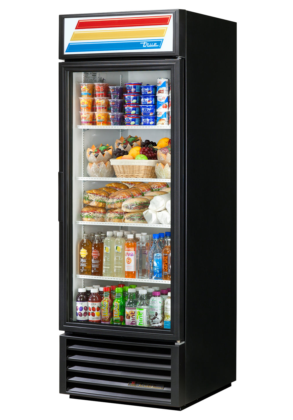 One wonderful option is the True GDM-23-HC~TSL01 it is a one swinging glass door, refrigerated merchandiser with LED lighting. It is energy efficient in keeping its contents cold due to the foamed-in place, high density, polyurethane insulation that keeps the entire cabinet from losing heat. The top of the unit features an illuminated sign panel that has a variety of customization options for you to choose from. The exterior features non-peel or chip black laminated vinyl which is durable and permanent. The interior includes an NSF approved, clear coated aluminum liner and stainless steel floor. The floor was designed to prevent the danger of harmful bacteria that will reside at its bottom from accumulating.
