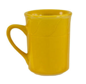 Assorted colors are: dark blue, green, light blue, orange, red, and yellow and are finger print/glare resistant with a narrow rim body. They have a capacity to hold 8-1/2 ounces, each feature an embossed design and constructed of vitrified ceramic.