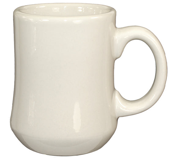 This Cancun Princess style mug is round with a rolled edge, holds 8 ounces, and has a diameter of 3". It includes a handle, it is fully virified and constructed of stoneware-ceramic that is American white in color.