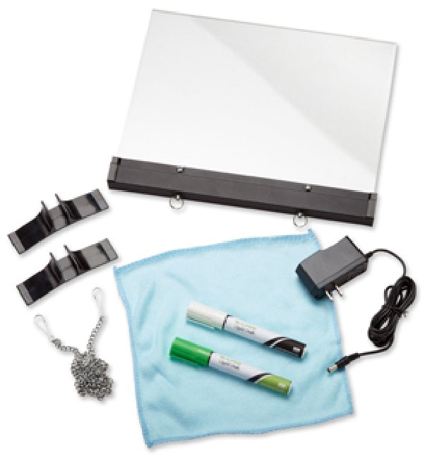 Write-On LED Marker Board, 9" x 11-4/5", surface or wall mount, with acrylic stand, 28 different flashing LED styles, can be used vertically or horizontally, includes: (1) hanging chain, (2) colored markers, (1) erasing towel, (1) power adapter, and (1) user manual, acrylic writing panel