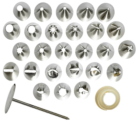 Cream Nozzle Set, 26-piece, includes storage box, a standard coupler and (1) metal flower nail, rust resistant, stainless steel