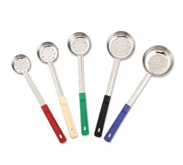 This portion control spoon has a perforated round bowl which holds 8 ounces. Constructed from one-piece stainless steel it has no weld joint where food can collect. It measures 10-4/5" in length and has a blue, grooved finger grip plastic handle with a hanging hole.