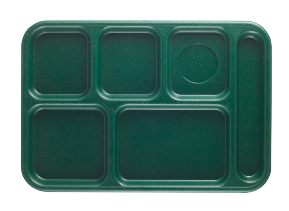 Great for school cafeterias, the Cambro BCT1014119 tray measures 141⁄2 inches by 10 inches—a size suitable for breakfast and lunch programs. Its ABS plastic construction is a medium-duty option between heavy-duty polycarbonate and economical copolymer. Because the surface is textured, it's resistant to scratches, and its Sherwood green stands out on table tops. Its six compartments are ideal for standard cafeteria serving.