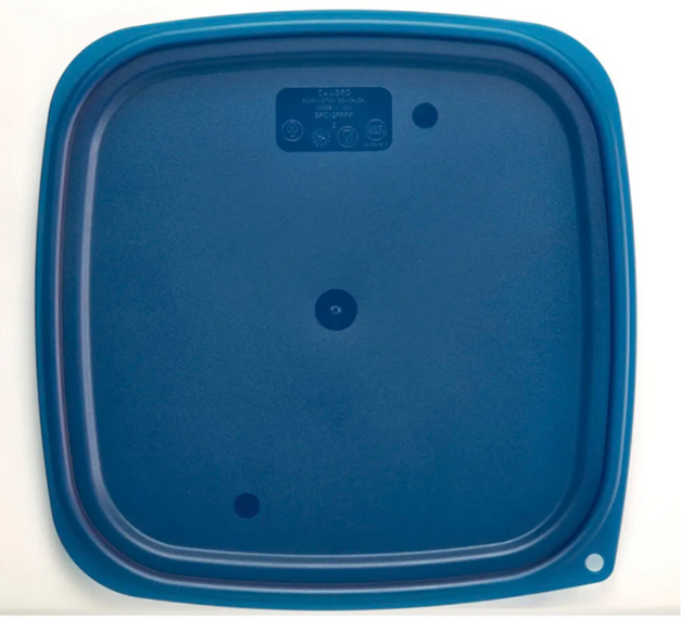 For flexibility, the Cambro SFC12FPPP267 Easy Seal cover fits the Cambro 12SFSPROCW135 food container, the Cambro 18SFSPROCW135 container, and the Cambro 22SFSPROCW food storage container. This square polyethylene piece resists odors and stains to preserve its original quality through high-volume use and is safe to run through a dishmachine cycle to ensure through sanitization. While its blue hue can be added to existing color-coded systems to indicate the types of contents stored in the containers, its translucent construction provides some visibility of the contents so staff can gauge inventory at a glance. For convenient, sanitary storage, it's built with a hanging hole.