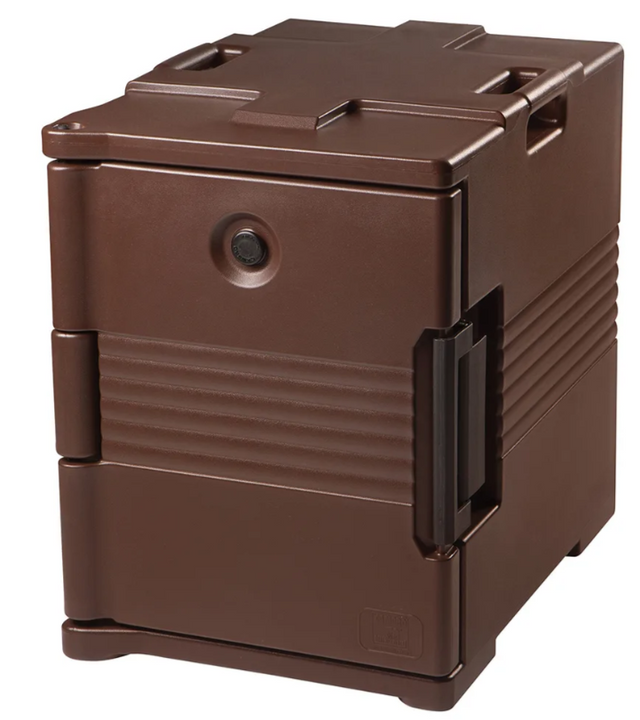 Keep your foods secure and at the correct temperature while transporting them with this Cambro UPC400131 Ultra Camcarrier front load pan carrier. Because of its one-piece polyethylene construction and polyurethane foam insulation, this 60 quart pan carrier maintains food-safe temperatures for up to four hours. The air-tight gasket guarantees temperature maintenance so that your foods stay fresher for longer. A pop-up vent releases steam to keep food from becoming soggy. Able to hold half-, third-, and full-size pans, this foam-insulated pan carrier is stackable for storing and moving a large amount of food at once. The molded in handles, nylon latch, and built in seal provide the best in food carrier security so that you do not have to worry about accidents or spills. The dark brown finish looks professional and will easily hide dents, scratches, and stains. The 270-degree swing open door makes loading and unloading the Cambro UPC400131 Ultra Camcarrier front load pan carrier easier.