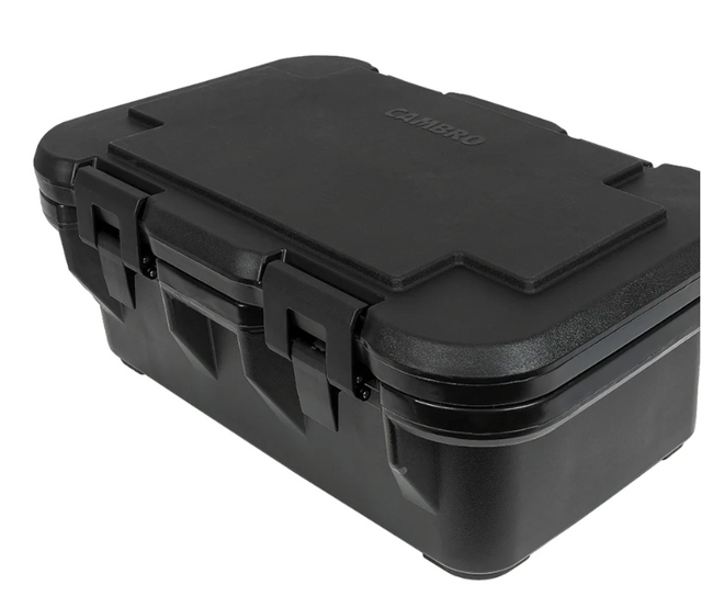 The Cambro UPCS160110 pan carrier is a must have for catering services, delivery, and food transportation. This insulated pan carrier has a 20 quart capacity and accommodates full-size, 6-inch deep food pans. A built-in seal keeps hot or cold air inside the carrier and makes cleaning easier. The self-venting design releases steam as needed to equalize pressure in the carrier. Foamed-in polyurethane insulation helps keep food held at a safe temperature. The molded-in handles and nylon latches make carrying your pans secure. This top loading pan carrier has a black finish and is stackable for easy storing and transporting. The exterior polypropylene construction is durable and resists denting and scratching while being lightweight and dishwasher safe. For the best holding results, preheat or pre-chill the carrier 20 to 30 minutes before using. The Cambro UPCS160110 pan carrier can stack on other carriers to make storing and transporting easier.
