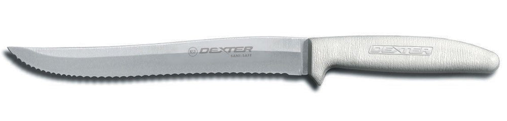 This Sani-Safe 13483 Utility Slicer Knife has an 8" scalloped edge and is constructed of DEXSTEEL, a stain-free, high-carbon steel blade, with an individually ground and honed edge. It also has a white, textured, slip-resistant, easy-to-clean polypropylene handle which withstands both high and low temperatures.