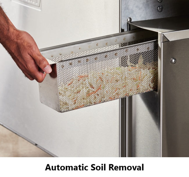 The opening of the chamber is tall enough to hold wares as tall as 19-1/2". This unit works by using a conveyor. The Rapid Return feature allows for this process. As the dirty products moves through the unit on the conveyor, anti-clogging KYNAR resin nozzles spray the wares clean and any food particles on the wares are collected by the waste management system. In order to keep the temperature nice and hot, thermal layer curtains and insulated inspection doors keep that heat from escaping.