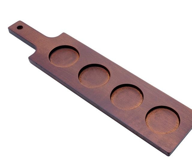 The Libbey 96381 wooden serving flight will enhance the presentation of any beer flight. With four recessed, circular holding areas that each measure 21⁄4 inches in diameter, it can accommodate four beer tasting glasses at a time. It is also compatible with dozens of Libbey glasses so you can choose a glass that best complements your business's tabletop style. It is recommended for hand-washing only, as a dishwasher can damage the wood. The flight includes a 1⁄2-inch hole in the handle that allows it to be stored hanging on the wall.