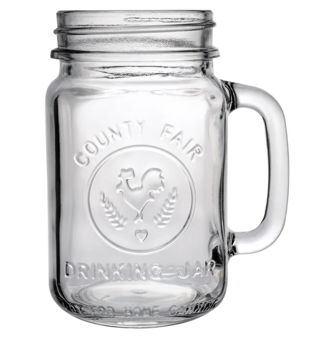 The Libbey 97085 county fair drinking jar design can hold up to 161⁄2 ounces. This glass features a design reminiscent of mason jars, with a squared container and a rounded top. The sturdy handle makes lifting and gripping the drinking jar easy. One side of the jar features an embossed design, which includes an image of a rooster in a circle and the words 'County Fair Drinking Jar'.