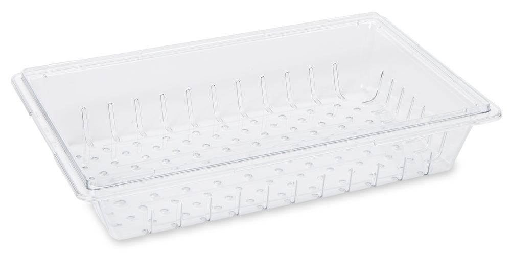 This Rubbermaid colander/drain tray is constructed of break-resistant clear polycarbonate for visibility, durability, and stain-resistance and has easy lift handles. It can fit full-size food storage boxes 6" deep or greater.