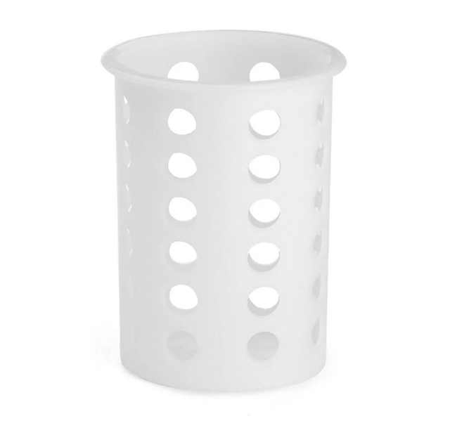 To facilitate rapid drying, the Tablecraft NY33 flatware cylinder features a series of symmetrical perforations that are ideal for storing freshly washed silverware. Its white nylon construction is easy to clean and can be used for both back-of-house and self-serve applications.