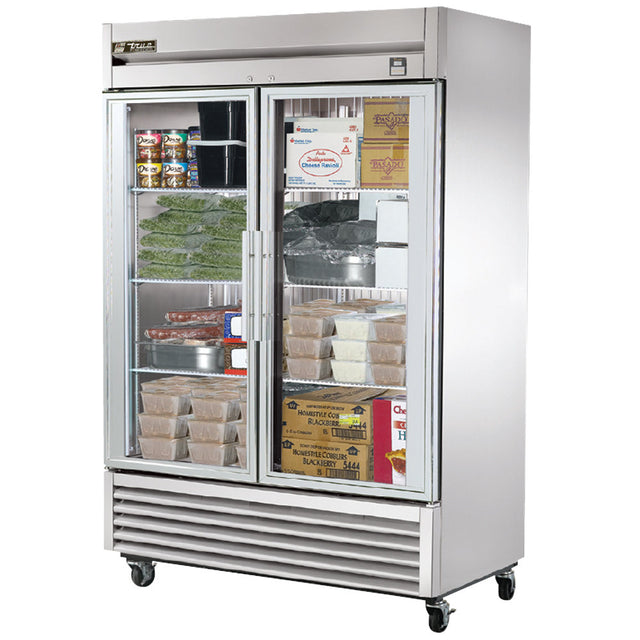One of our highest recommended units it the True TS-49FG-HC~FGD01 reach in freezer from True. The cabinet is constructed with high density, polyurethane insulation. The exterior is constructed of a stainless steel front and aluminum alloy on the sides, back, and top. It has two sections of full height, glass doors that include a positive seal, self closing feature and life time guaranteed door hinges that include the torsion type closure system. The interior features an NSF approved, clear coated aluminum liner and a stainless steel floor. The inside also includes three adjustable, heavy duty PVC coated wire shelves per section.