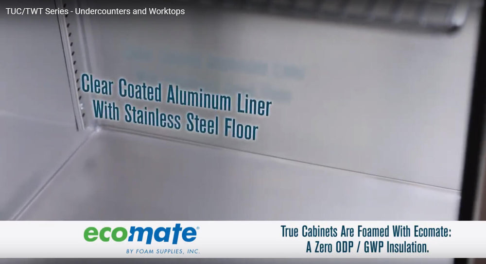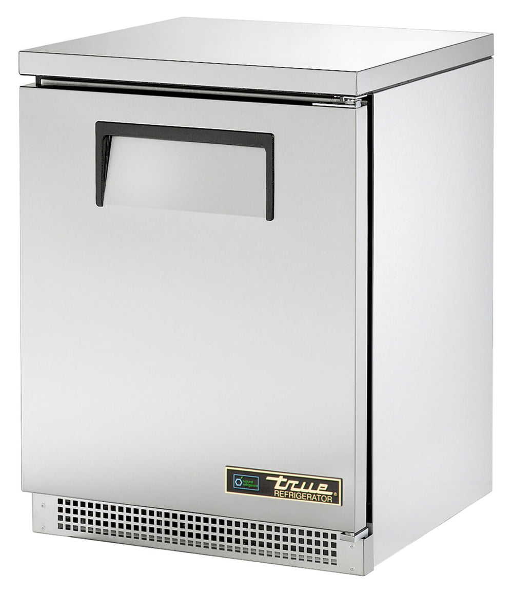 One product is the True TUC-24-HC undercounter refrigerator, it is energy efficient in keeping its contents cold due to the entire cabinet structure and doors being insulated with foamed-in-place, high density, polyurethane. The exterior is constructed of stainless steel in the front, top, and sides, with a matching aluminum alloy finished back -- all of which is resistant to rust and corrosion. The single stainless-steel door includes a positive seal self-closing feature as well as a stay open mechanism. The interior features an NSF approved clear coated aluminum liner and a stainless-steel floor. The stainless-steel floor is not just for speedy cleaning, but this design also prevents the danger of harmful bacteria that will reside at the bottom of the refrigerator from accumulating. It includes two adjustable, heavy-duty PVC coated wire shelves on four chrome plated shelf clips included per shelf.