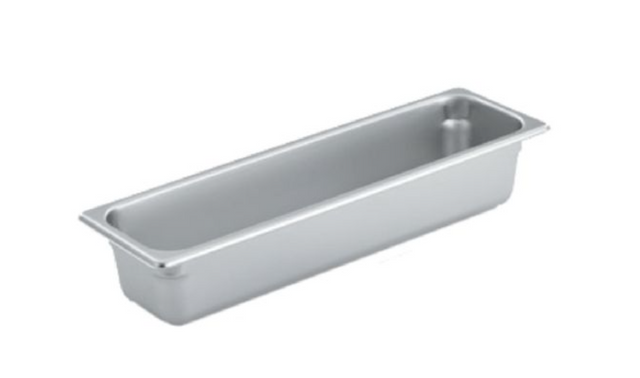 The S20064 is a 1/2 size long, 4" deep stainless steel Super Pan heavy-duty steam table / hotel pan from Vollrath with a 5 1/4 qt capacity and an anti-jamming and flat corner design that helps keep pans tight in food wells. The Super Pan steam table / hotel pan is made with 20 gauge, 300 series stainless steel.