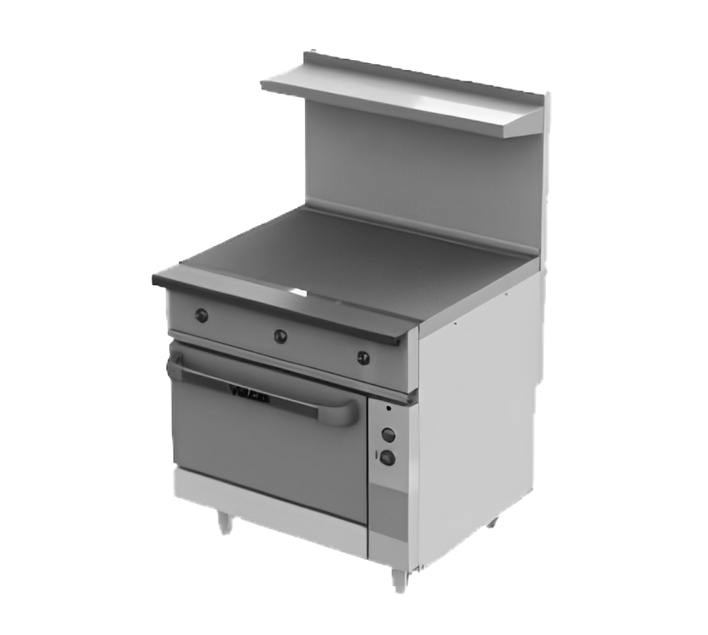 EV36-S-3HT-480 Restaurant Range, electric, 36", (3) hot tops, infinite controls, standard oversized oven, includes (1) rack, stainless steel front, sides, single-deck high shelf, 6" legs, UL, NSF, 480v