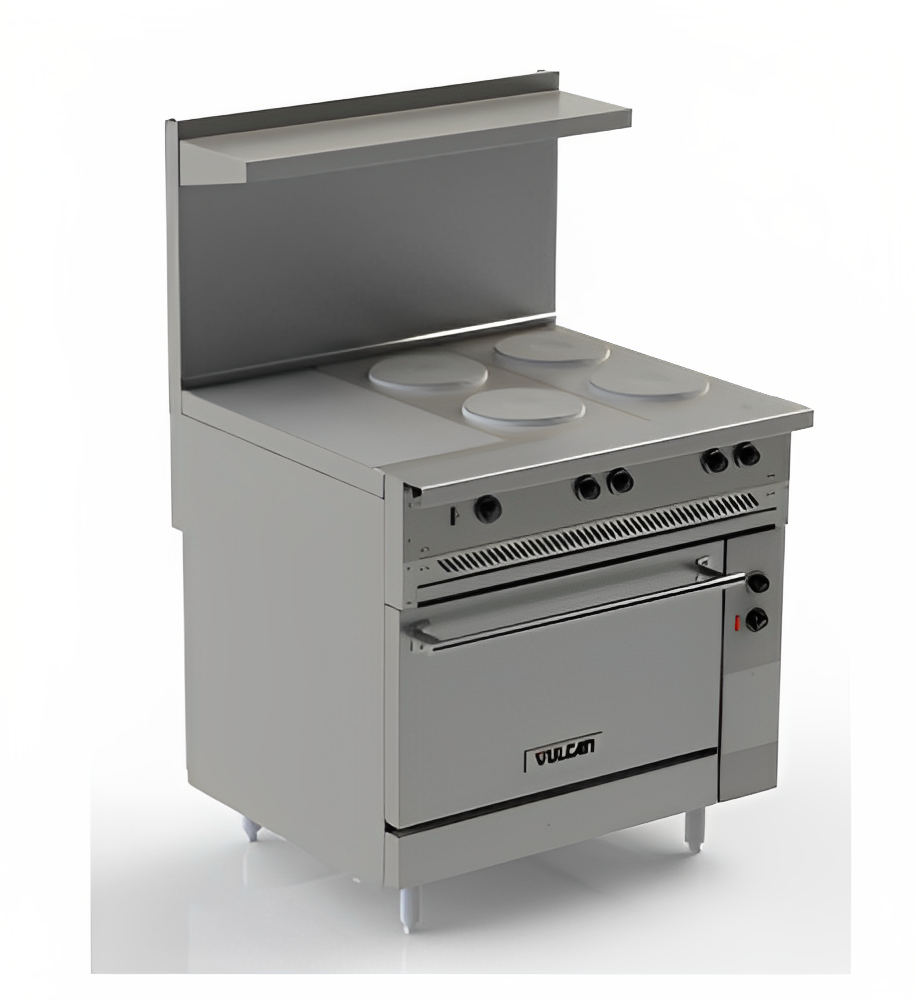 EV36-S-4FP12G480 Restaurant Range, electric, 36", (4) 2.0 kW French hot plates, infinite controls, (1) 12" griddle, standard oversized oven, includes (1) rack, stainless steel front, sides, single-deck high shelf & 6" legs, 480v cULus, UL EPH Classified, NSF