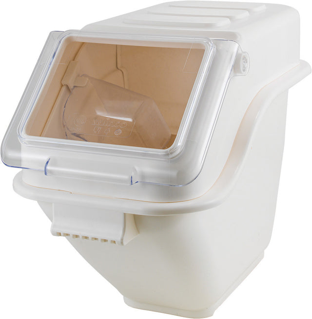 The clear, plastic front lid on the cover makes it simple to identify ingredients with a single glance. The scoop with a dedicated clip ensures sanitation compliance. It holds 5 gallons and has a polypropyleme body.